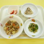 すき焼き風煮、ほうれん草のごま和え、いちご。おやつは、昆布おにぎりと麦茶です。新年度がスタートしました。環境が変わりましたが、今日のメニューは食べ慣れている和食だったので、子どもたちもモリモリ食べている様子でした。デザートは春らしいいちごだったので、全体的に彩りもよい献立になりました。今年度も子どもたちに「美味しい!」と言ってもらえるような給食・おやつを作っていきたいと思いますので、よろしくお願いします♪